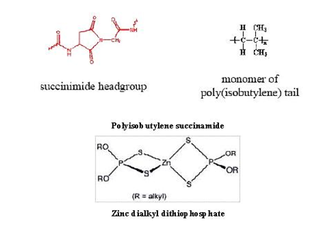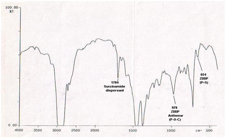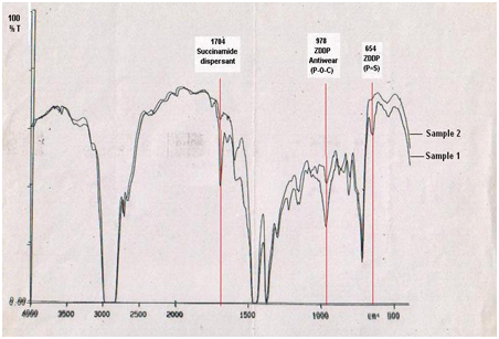 Viscosity of the fluid changes with the temperature, hence engine oils are formulated by Viscosity index improvers to withstand proper lubrication at higher temperatures. After oil is used viscosity of the oil either decreased due to any fuel dilution during the run or increases due to sludge formation by oxidation of the oil. The recycled oils do contain some amount of viscosity index improvers of the past formulation. The (Table 1) shows Kinematics viscosity of counterfeit oil sample is less than that of genuine engine oil sample at 100°C. Kinematic viscosity at 100°C and specific gravity of the genuine engine oil are compared with the results of counterfeit engine oil (Table 1). The interpretation reveals that the values do not match the genuine engine oil; hence the other parameter TBN was performed. The TBN determines the amount of base to neutralize the sulfur by-products namely sulfurous and sulfuric acids, to retard the corrosive damage to engine. The (Table 1) shows TBN value of genuine and counterfeit engine differs primarily; this implies that the counterfeit Castrol 15W40 may be crudely recycled used engine oil. To confirm this belief, both the samples were tested for Infrared Spectroscopy (FTIR). FTIR spectra from the range 4000cm-1 to 400 cm-1 were recorded. The spectra of Genuine Castrol CF4 15W40 is shown in (Figure 1) and that of counterfeit Castrol 15W40 is shown in (Figure 2). Infrared spectra for two major additives, polyisobutylene succinamide and Zinc dialkyl dithiophosphate shown in (Figure 3) were studied. The FTIR spectrum in (Figure 2,3) shows characteristic absorbance at 1704 cm-1 for succinamide dispersant in Genuine Castrol CF4 15W40 engine oil and depleted peak in counterfeit Castrol CF4 15W40 sample at same wave number. Similarly Zinc dialkyl dithiophosphate antiwear additive shows infrared stretching vibration due to P-O-C bond between 950cm-1 and 1020cm-1 and P=S bond between 640cm-1 and 665cm-1 in Genuine engine oil sample and depleted peak in counterfeit oil sample in the respective wave numbers.