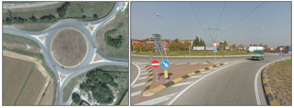 The second roundabout as a central island with a diameter of 60 m and four entries and exits with only one single lane. The circulating carriageway, instead, have two single lanes. The central island is circular, elevated by curbs and covered by grass and trees (Figure 3). In order to avoid participants feeling disoriented, the route was planned in very simple orientation terms. Starting from the first roundabout, the driver proceeded ahead to the next one, and then was given instructions to return along the same road back to the starting point. The average time in which the distance was covered was about 10 min.
