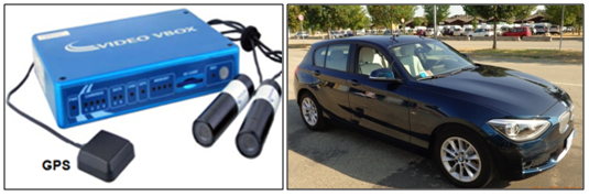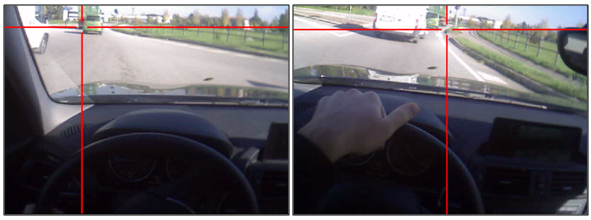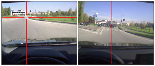 Data collection was carried out from 10.00 to 12.00 and from 14.00 to 16.00, in order to avoid peak rush hours. Three sessions took place on three different days. It was sunny during both sessions. All participants drove a BMW 1 Series car. The car has been equipped with a VBOX PRO data logger, for recording of acceleration, speed and GPS coordinates of the vehicle (Figure 4). Two cameras and a GPS antenna were positioned on the top of the car and connected with cables to the VBOX. Each driver was given a trial run to get used to the car, before starting along the test route. Each participant has been equipped with the ASL Mobile Eye-XG eye tracker. It is a mobile eye tracker, an eyeglass with two digital high-resolution cameras (Figure 5).One camera recorded the scene image and the other the participant’s eye. Eye tracking was performed on the right eye. Data recording was at a speed of 30 Hz and an accuracy of 0.5–1°.11,12 ASL software was used to create a video for each participant, in which eye-fixations were showed by a cross, at the intersection between a vertical and a horizontal red line (Figure 6). These lines were superimposed to the video of the driver’s scene, allowing researchers to detect each saccadic movements and what specific point of the scene was being seen by the participant. A calibration procedure was carried out for each drivers, in order to get a good accuracy of the eye-movement recorder. The process took place in a parking area, with the car being stationary, and involved asking participants to look at least 15 visual points spread across the whole scene. Calibration points were chosen between vertexes and centers of small objects present at the scene.