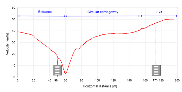 From the results obtained by VBOX PRO equipment the velocity of the vehicle has been evaluated for each participant, in order to estimate the influence on the drivers behavior of pedestrian and bicycle crossing located near the entries and the exits of the roundabout. In this position, in fact, the driver must see the crossing area and must adequate his driving behavior if there are vulnerable road users in waiting or cross walking. For each participant the same behavior has been observed (Figure 7).