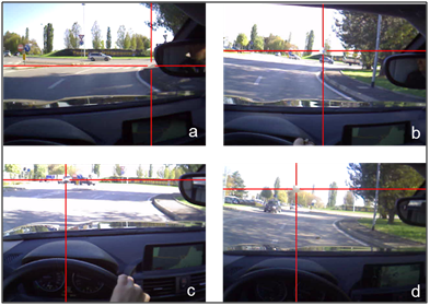 This behavior is protracted also during the exiting maneuver and it is maintained until the previous vehicle oversteps the pedestrian and cycling crossings. In that moment, the visual attention moves to the crossing area in order to detect the presence of pedestrians and/or cyclists on the central island or on the access ramp to the sidewalk (Figure 9). When the absence of vulnerable users is confirmed, the sight point focuses back again to the previous vehicle. The eye saccades, however, does not implicate that users slow down the speed, as emerged from the analysis of kinematic parameters of the vehicle. Considering the situation in which the level of traffic is higher, the frequency of observation and the research of information in the visual field increase. When traveling along the ring, users frequently modify the sight points in order to maintain a safe distance from the previous vehicles both inside and in the entrance of the roundabout.