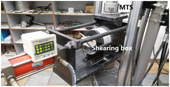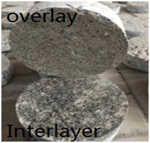 In the test, eight slabs were constructed, which correspond to eight test groups in the Table 3. The thickness of substrate and interlayer were 5cm and 2cm respectively. After being cured for several days, each slab was drilled to get eight cylindrical specimens with diameter of 150 mm. These specimens were tested with MTS and vertical shearing instrument. The shearing box of vertical shearing instrument consisted of a fixed semicircular iron box and a movable circular iron box. The shearing interface between these two boxes was vertical. The vertical shearing instrument is shown in Figure 1. No parallel force was loaded and normal shear displacement was controlled as 1.0 mm/min. For the samples with asphaltic interlayer, the shearing interface is between asphaltic interlayer and overlay. The weight of overlay which would be loaded is around 21.2N and the maximum of shearing force in the test is between 3000N and 20000N. Thus, the effect of the mass of the sample on the measured load can be neglected to some extent.
