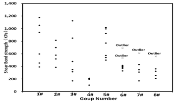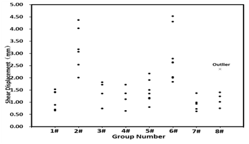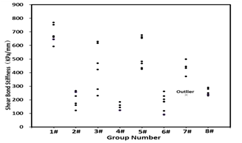 For eight groups the shear bond strength, displacement and stiffness are shown in Figure 2– 4 respectively. The values which are not between Q1–1.5IQR and Q3+1.5IQR is thought to be outliers and would be deleted (Q1, Q3, IQR represent upper quartile, lower quartile and quartile). Average of each group was used to fill the missing values caused by the outliers or the damaged specimen during the drilling.
