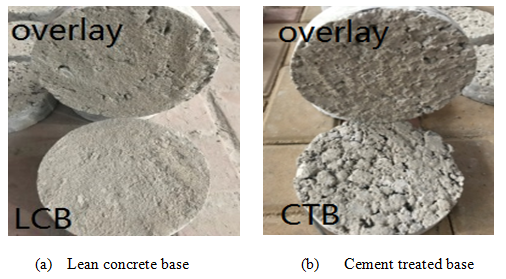 Compared with the lean concrete base, the shear bond strength of cement treated base decreases by 17.5%. Because the strength of overlay is higher than substrate, the initial interface detach starts at the material approaching to the substrate, which means that the shear bond strength depends on the strength of substrate. The infiltration test shows that cement treated base is totally permeable with water permeability coefficient of 923.08 ml/min and the lean concrete is almost impermeable. And the sand equivalent test shows that the surface texture depth of cement treated base with value of 1.48 mm is higher than the lean concrete with value of 0.5mm. Although these would result in more overlay mortar permeating the cement treated base and then increase its strength, the substrate is still weaker than the lean concrete owing to unconsolidated surface of cement treated base. Thus, the shear bond strength of lean concrete is higher than the cement treated base. Besides, in comparison with the specimen with lean concrete base (Figure 6a), the one with cement treated base (Figure 6b) has a rougher interface after the detachment of overlay and substrate. It means the surface of cement treated base still has more pores and its effective contact area is smaller than that of lean concrete base, which will result in lower shear bond strength.