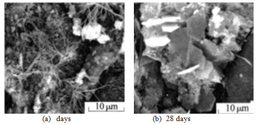 Substrate age has a significant influence on the shear bond strength and stiffness. Compared with the substrate of 7– day curing time, the shear bond strength and stiffness of the 20– day curing substrate decrease by 47.5% and 19.3% separately. Cement treated base and lean concrete base both consist of cement and aggregate. Hydration reaction plays a vital role in the strength of substrate. And the bond strength mainly comes from the interlocking and cohesion. Cohesion mainly consists of chemical bonding. As for the substrate with a short curing time, most of the cement would not finish the hydration reaction. If overlay is constructed on substrate at the young age, cement of both overlay and substrate would react together and the products enable them to firmly connected, and that’s to say, the chemical bonding between overlay and substrate is stronger. By contrast, the hydration reaction in the long curing substrate has stopped or would be at a slow rate, which weakens the connection between substrate and overlay. In addition, Li10 found that microstructure and hydration reaction products of concrete would change with curing age. Through scanning electronic microscope, the microstructure of 28– day curing concrete (Figure 7b) was denser and the amount of product was higher in comparison with the 3 day curing concrete (Figure 7a). The pore ratios of the former and latter were 11.02% and 13.64% respectively. Thus, for the substrate, the longer curing time, the less mortar of overlay permeating into the pore. This would result in the weaker interlocking. And at last, the lower cohesion and interlocking between overlay and substrate would result in smaller shear bond strength. What’s more, for the old substrate, it would seldom shrink. So when overlay is constructed on the old substrate, there would be plenty of micro– cracks in the interface because of the shrink of overlay in the early period.11