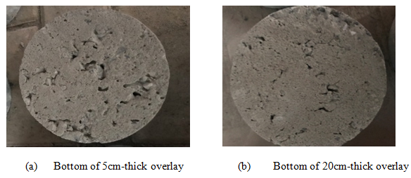 Overlay thickness has a significant influence on the shear bond strength. Compared with 5cm– thick overlay, the shear bond strength of 20cm– thick one increases by 34.4%. The thicker the overlay is, the more pressure at the bottom of overlay, which makes it easier for the mortar to flow into the substrate or the asphaltic interlayer. Once this mortar solidifies, the shear bond strength comes into being. In addition, during the construction of overlay, it is unavoidable to produce some bubbles in the cement concrete. Those bubbles at the bottom of overlay would affect the shear bond strength. However, if the overlay is thick enough, those bubbles would disappear owing to the great pressure from the overlay, which keeps interface from the stress concentration and then enlarges the shear bond strength. Some interface of broken specimen could serve as evidence. Compared with 5 cm– thick overlays (Figure 8a) the pores at the bottom of 20cm– thick (Figure 8b) overlay are fewer.