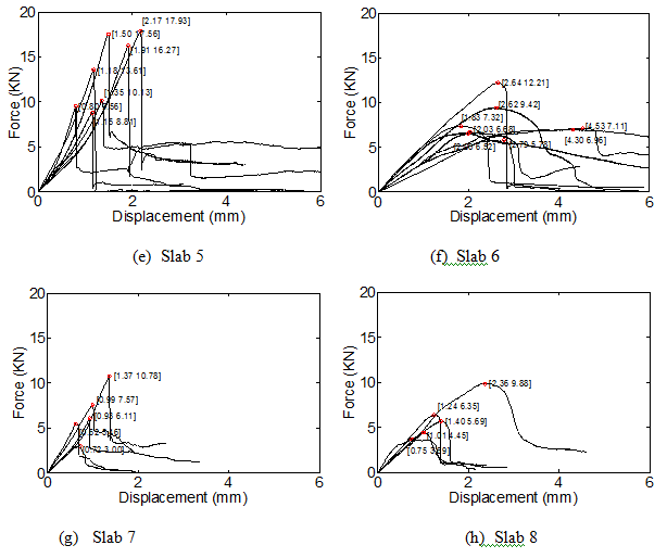 As shown in Figure 5, for the samples without an asphaltic interlayer (slab 1,3,5 and 7), before reaching the maximum force, the shear force increases linearly and after reaches the peak, the shear force decreases to a small one immediately. The samples seem brittle. Whereas, the samples with an asphaltic interlayer (slab 2,4,6 and 8) seem flexible, which shear force decreases slowly after the sliding starts between layers. The shearing failure between samples with asphaltic interlayer and ones without asphaltic interlayer is different in the increasing velocity, the decreasing velocity and the shear bond displacement. If an asphaltic interlayer is flexible enough, it would weaken the constraint on the overlay slab and then reduce the crack and the other failures of overlay slab. At this point, it is available to set an asphaltic interlayer to improve the performance of cement concrete pavement.