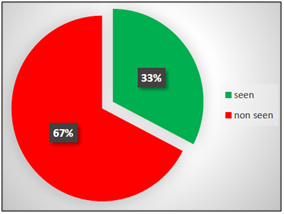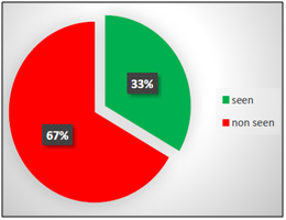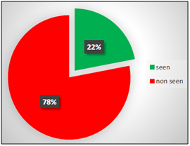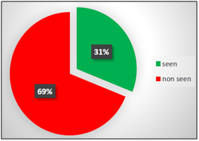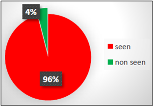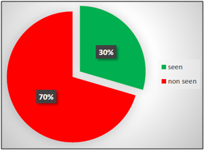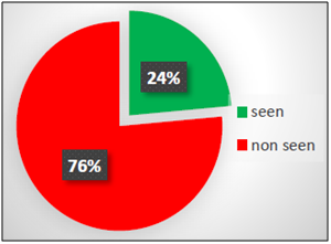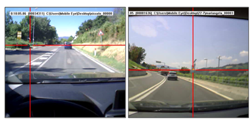 By processing the recorded videos, it was possible for each participant to identify which traffic signs have been seen and which ones have been ignored. This procedure has led to a preliminary analysis in terms of percentage of what has been detected. ASL software was used to create a video for each participant, in which eye-fixations were showed by a cross at the intersection between vertical and horizontal red lines. The frequency of each video is 30 frames per second (1 frame = 33.33 ms). These lines were superimposed to the video of the driver’s scene allowing researchers to detect each movement and which specific point of the scene was being seen by the participant. The procedure to determine if a sign has been seen or not is the following: if the red cursor (that indicates the point of look), is superimposed to a sign (or it is very close to it) that is already entered in the visual field of the participant, the PC user considers the sign as “seen”. If this does not happen, the PC users consider the sign as “not seen”. In the case of “tracking loss” by the device, the sign is not considered in the analysis (Figure 2). After each trial, all participants had answered some questions such as name, gender, age, driving license category and its date of issue, kilometers driven per year, number of accidents caused by the participant since the driving license issue date, self-evaluation of the own driving skills (very good, good, average, poor, very poor) and knowledge of the road. Driving ability was evaluated as very-good by one participant (6.7%), good by ten participants (66.7%) and on average by four participants (26.6%). None of them have evaluated their driving ability as poor or very-poor.