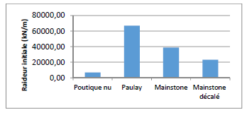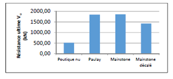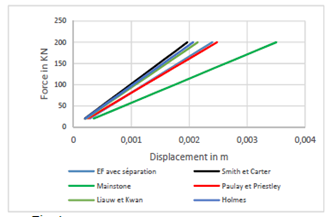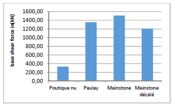 Regarding the initial stiffness K0, the largest increase is that of Paulay model which equal to 870% of the initial stiffness of the bare frame, and the model of Mainstone, it is 463% and the growth of the initial stiffness of the frame if the shifted Mainstone model is equal to 236%. b-the strength limit state. For the ultimate limit state of resistance, we note the increase of the ultimate shear force Vu and decreased displacement of the ultimate limit for all models compared to the bare frame. For the model of Paulay, increasing Seen is 259% and the decrease in the limit displacement is 90%, on the model of Mainstone increasing Vu is 463% and decreasing the limit displacement is 87%, and for the shifted Mainstone model with increasing Vu is 176% and the decrease in the displacement of the was 79%.10