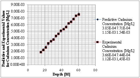 Figure 1 Predictive and experimental values for cadmium concentration at different depth.