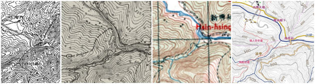 Figure 3 Comparison of the Neiwan powerhouse location pictured at the maps from1907, 1924, 1956 and 2019. Maps based on Taiwan's century–old history map from the Center for GIS – Academic Sinica,12 (Red dot shows the location of the powerhouse and the green dot the location of the inflow).