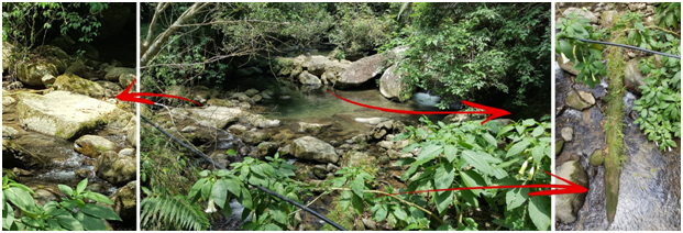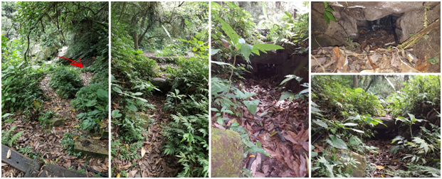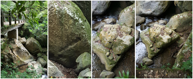 Figure 6 A series of stone marks around the current 2nd bridge on Matai forest path showing traces of bamboo supports. During Japanese occupation period, due to lack of steel a bamboo reinforced concrete was quite common. Bridge no. 2 was also the place where supply canal crossed the valley most likely via aqueduct possibly supported by exactly bamboo reinforced concrete.