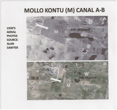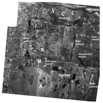 Figure 1 Aerial photo view of the inland drainage channel surrounding the ceremonial core of Tiwanaku indicating the intersecting Mollo Kontu (M) canal, qocha.