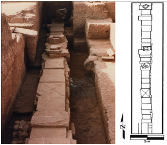 Figure 4 Photo and plan view of the excavated portion of the subterranean Putuni channel P. Image from Couture and Sampeck, 2003: 235.