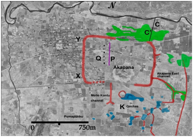 L: Akapana East canal, which drained qocha region K toward drainage channel
