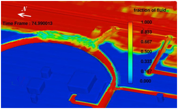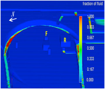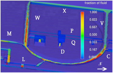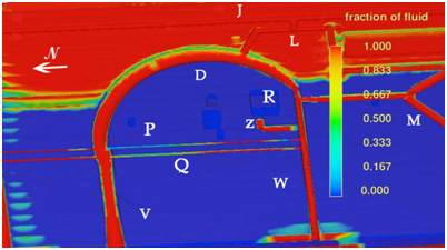 Figure 13 Dry season Case 2 fluid fraction results for the monumental center with decreased water supply from spring-supplied canals; rainfall infiltration and seepage limited by large paved and roofed areas of the ceremonial center.