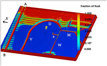 Figure 9 Case 1 fluid fraction results showing water input from canal M to subterranean canals P and Q flushing wastewater from the Putuni complex toward drainage canal arm V and subsequently to the Tiwanaku River A- B.