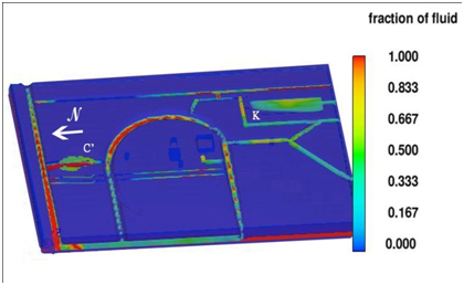 Figure 10 Dry season case 2 fluid fraction results on a cut plane below the ground surface; moisture levels in cocha region K and depressed area C indicate sustainable pasturage and agriculture due to contact with the deep water table.
