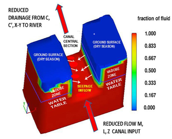 Figure 7 Post rainy season detail of the east arm of the drainage channel showing the seepage surface conducting water to the bottom of the canal and progressive surface drying for Case 1 conditions.
