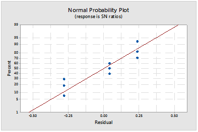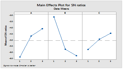 Table 4 shows the experimental results and corresponding S/N ratios at each level of the machining parameters. The surface roughness was varied from 1.226 to 2.226µm, the lower feed and higher speed resulted in the better surface finish. (Figure 3) shows the main effect plot for S/N ratio, it reflected that the surface roughness increases with the increment in feed rate, decreases with increment in spindle speed and depth of cut. However, it has been seen that the effect of depth of cut is comparatively smaller on the surface roughness. The normal probability plot (Figure 4) of the residuals shows that the errors are normally distributed. Table 5 is the response table mean S/N ratio for surface roughness and Table 6 is response table for surface roughness mean data. The ranks indicated in Table 5&6 shows the relative importance of each factor in the response. The results of analysis of variance (ANOVA) (Table 7) reflects that the feed (59.84%), spindle speed (29.58%) considerably affects the surface roughnessand depth of cut (9.162%) has an insignificant effect on surface roughness. The results of experimentation clearly reflect that the optimal combination of the machining parameters for surface roughness is found at 3000 rpmspindle speed (A), 500mm/min feed rate (B), and 0.15mm depth of cut (C). Further, for the optimum condition obtained from the analysis, experiments were conducted and surface roughness of the sample was evaluated. (Figure 5) shows the surface roughness plot of the high chromium steel sample for optimum cutting conditions. For the optimum settings, the surface roughness was 1.184µm.