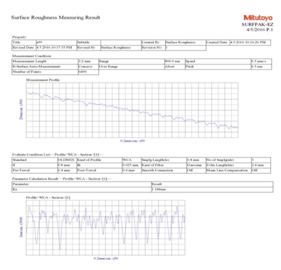 The work‒pieces were cleaned by acetone and soapy water after every experimental run before surface roughness test. Figure 2 shows the surface roughness testing machine used during experimentation. The specifications of the surface roughness testing machine includes: traverse speed: 1mm/second, measurement unit: metric/inch, cut‒off values: 0.25mm, 0.80mm, 2.5mm (0.01 in, 0.03 in, 0.1 in), parameters: , , (DIN), and , calculation time: less than reversal time or 2 second, whichever is longer. Further, the surface roughness was also measured by the Proscannon‒contact surface profiler having the S5/03 optical sensor (10nm resolution) following BS EN ISO 4288 (1998), BS EN ISO 3274 (1998) and BS EN ISO 4287 (1998).29‒31 The average value of surface roughness was calculated considering 20points along the machining path and each measurement was taken for 300:1 bandwidth and 4mm evaluation length with 0.8mm cut offs. The microstructure study using SEM is conducted on the machined sample surfaces for examining the microscopic defects with and without application of coolant.