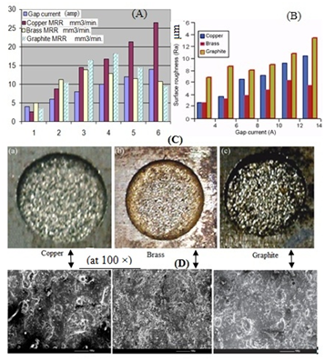 Figure 9 (A) Effect of gap current on MRR for different electrodes in high chromium steel samples (B) Comparison of surface roughness obtained using different electrodes in high chromium steel samples (C) High chromium work material after EDM at 14 A using different electrodes (D) SEM Micrograph of high chromium steel samples (at 100 ×) of transverse surface machined using different electrodes.