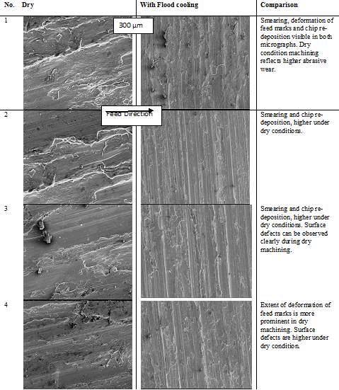 Further, the effect of flood cooling on surface integrity was studied. Five experimental runs (with/without flood cooling) were performed at optimum cutting conditions obtained from Taguchi analysis for further investigate the surface roughness and surface integrity of high chromium steel samples after end milling. (Figure 6) shows a plot of the average surface roughness of machined samples of high chromium steel for optimum conditions, average surface roughness was calculated by measuring the surface roughness of each machined sample at 20 points. The figure clearly shows that the surface roughness of the samples while flood cooling is employed is 20.92% lesser at an average than the dry conditions. Table 8 shows a comparison of SEM micrographs of machined samples. It can be clearly observed by the SEM micrographs that deformation of feed marks, smearing and chip re‒deposition is prevailing for all the samples irrespective of dry machining or machining with flood cooling. During dry machining higher surface defects, deformations of feed marks are observed due to as there is a higher cutting temperature than machining with flood cooling. Likewise, smearing is also more governing in dry machining.It is visible from the SEM micrographs that coolant reduces the surface defects; chip re‒deposition, plastic deformation, smearing, and cleaner cuts are produced with the introduction of coolant. It is evident from SEM micrographs that the machined surfaces chiefly comprise partially irregular pits and longitudinal grooves. The occurrence of grooves shows micro‒ploughing and micro‒cutting effect and the wear mechanism chiefly includes abrasive wear. The pits and prows are also visible in the micrographs which indicate the inclusion of adhesive wear. The microstructure examination concludes frequent abrasive wear with a few traces of adhesive wear. (Figure 7) shows the optical scan of the machined surfaces of high chromium steel sample with/without flood cooling which reflects that widespread plastic deformation has occurred in both dry and flood cooling. The results of optical scan reiterate the results shown by the SEM micrographs.