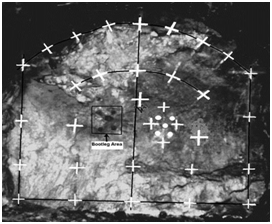 A tunnel or drift blast starts with a cut because it provides a free face to which the remainder of the round may break. It is the most critical part of the blast design because the round cannot pull to the designed depth unless the cut comes out as planned. The events associated with the pulling of the cut are so remote from the perimeter that there is a tendency to believe that blasting of cut holes has no significant effect on blast damage. But that is not true. If progressive relief is not achieved in the cut area, then later firing charges will be over confined thus resulting in higher magnitude of ground vibrations and significant damage. Minimum blast damage requires that each hole fragments and displaces its burden with a reasonable ease.8 Damage to the drift face from cut blasting has been shown in Figure 5. The following suggestions during cut blasting are made to minimize damage to the perimeter: