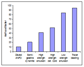 This produces good results but it does not meet the fume class requirements in Canadian underground mines. It is expensive, needs higher loading time and difficult to lock it in the hole. There is difficulty in pulling toes and sometimes it is found in the muck pile. The comparison of blast damage for different explosive products has been shown in figure 4. Half cast factor has been used as a measure of blast damage. This is length of the half barrels after the blast expressed as a percentage of the initial length of the blast holes. Higher the value of the half cast factor, lower is the blast damage.