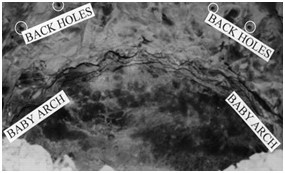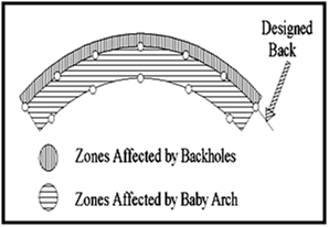 These are also called first-row-in or baby arch holes and are adjacent to the perimeter holes. The care in drilling and charging of these holes is important but often overlooked. Positioning them close to the contour of the excavation and overcharging results in damage to the perimeter. Ideally, the damage from the buffer holes should not exceed the damage zone from the perimeter holes as shown in Figure 6. In one of the blasts, all holes except the back holes were fired. If the buffer holes are charged spaced and burdened properly then the damage to the back can be minimized. As displayed in figure 7, the contour of the buffer row holes was pretty close to the design and the back holes were not damaged at all.9