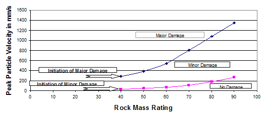 The strength and geology of a rock mass cannot be changed but their knowledge can facilitate the judicious selection of blast damage control measures. One can characterize the rock mass and formulate different strategies to excavate it with minimum damage. The rock mass rating (RMR) system developed10,12 was used in this study. The use of a single limiting value of Peak Particle Velocity (PPV), as in the case of blast damage criteria for residential structures, is not adequate and may result in damage to poor quality rock masses. Based upon the review of several case histories and work done by the author in different sites, the criterion for blast damage is proposed in Figure 8. The magnitudes of blast vibrations required for initiation and propagation of minor and major damage in rocks with different RMR values have been displayed. Minor damage includes loosening of open joints as well as joints with weak filling and reduction in the frictional properties of joints. Major damage is represented by fracturing of intact rock and rock falls. Based upon the quality of the rock mass, the blast design can be modified to keep the blast vibrations below the desired level.