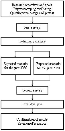 The second Delphi round was a shortened questionnaire designed to confirm and validate the results of the first round. It included four questions regarding the experts' extent of agreement with the constructed future scenarios for 2030 and 2050. Questionnaires were sent by e–mail alongside a summary of the results obtained in the first round. The rate of response was 66% (75% and 62% response rate among Israeli and international experts, respectively).