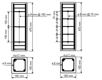 The behavior of medium scale reinforced concrete columns made with the produced concrete is investigated, taking into account the effect of different fiber volume and different transverse steel (stirrups). Eight columns were made with dimensions 150x150mm in cross section and 470mm in height. Two columns were made with no fibers as control columns, the remaining six columns were divided into 3 groups each included 2 columns; the fiber volume in the 3 groups was 0.08%, 0.12% and 0.52%. The main reinforcement of the columns was 4 bars 12mm in diameter. The stirrups used are 8mm in diameter. The steel reinforcement used for longitudinal and transverse reinforcement has yield strength of 425MPa. The transverse reinforcement (i.e. stirrups) was varied among the two columns in each group. In one column the maximum spacing of 150mm was used and in the second column the spacing between the stirrups was 75mm. The ID of the columns is C-X-150, or C-X-75, the (X) digit denotes the fiber volume percentage in the mix, the third number indicates the spacing between the stirrups (150mm or 75mm). Figure 1 is a schematic diagram of the columns’ details and test setup.