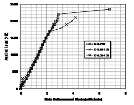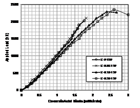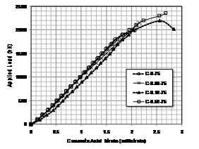 Concrete strain versus applied load for tested columns is shown in Figure 2. The main reinforcement strain for tested is shown in Figure 3. While, Figure 4 show the stirrups’ strain with applied load for columns. The strain gauge of the main reinforcement for column C-0.12-150 failed to measure any strain due to its damage during casting. As the fiber volume fraction increases the improvement in the column capacity increases up to 18%, however, with the lowest fiber volume fraction there is no significant improvement. Also, as the fiber volume increases the concrete strain at failure increases with the highest increase with fiber volume fraction of 0.52%, indicating better ductility and deformability of the concrete.