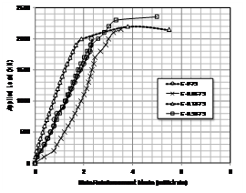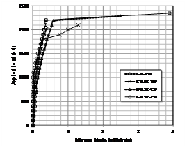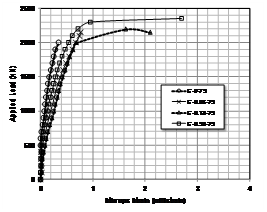 There is a significant improvement in the strain in the reinforcement and stirrups as the fiber volume fraction increases this is due to the confinement action of the fibers. It should be noted that the strain in the stirrups at failure reached or exceeded the yield strain value for Vf = 0.12% and 0.52%, indicating full activation of the stirrups action due to the better ductility and deformation of the concrete. With reference to Figure 4, stirrups’ strain with applied load, it is noted that the strain in the stirrups is very small up to almost the failure load for columns C-0-150, C-0-75, C-0.08-150- and C-0.08-75, which indicates that the stirrups are not fully activated and its confinement effect is not significant. On the other hand, when the steel fibers volume fraction increases, (Vf = 0.12% and 0.52%) led to a significant increase in the concrete deformability, therefore increasing the strain in the stirrups indicating activation of the stirrups’ effect in confining the concrete. This effect is noticed in the higher failure load and the significant increase in the main reinforcement strain and concrete deformation at failure. It is also noted that reducing the stirrups’ spacing has no significant effect in improving the behavior of the column.