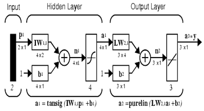 ANN is a nonlinear mathematical model that can simulate arbitrarily complex nonlinear processes that relate the inputs and outputs of any system. In many complex mathematical problems that lead to solving complex nonlinear equations, Multilayer Perceptron networks are common types of ANN that are widely used by researches . To use MLP model, the definition of appropriate functions, weights and bias should be considered. Due to the nature of the problem, different activity functions in neurons can be used. An ANN maybe has one or more hidden layers. Figure 2 demonstrates a three–layer neural network consisting of inputs layer, hidden layer (layers) and outputs layer. As shown in Figure 2. W is the weight and