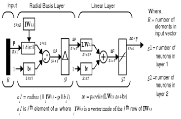Radial Basis Function (RBF) Neural Network is a type of artificial neural networks which widely uses in image processing, pattern recognition, and nonlinear system modeling. The RBF model as shown in the Figure 3 consists of two layers, the first layer considered a hidden layer and the second layer as the output layer. The radial function is considered the transfer function for the neurons which are in the hidden layer and linear function as output layer transfer function. Designing the RBF neural network is based on the defining the center of these functions in other to the aim of RBF model training is mapping the input space to output space as. The transfer function of the RBF model is defined as equation (3).