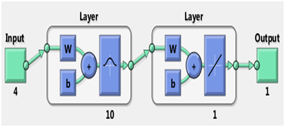 The MLP model contains two layers; inputs and hidden layers. The hidden layer contains ten (10) neurons and transfer functions were tangent sigmoid (tansig). (Figure 5) The MLP model structure is shown in the Figure 6. The training of the MLP model was performed with levenberg_marquat technique. 70 percent of data set was used for training, 15 percent for validation and other (15 percent) was considered for testing the model. The performance of MLP model in each stage of development (Train, Validation, and Testing) is shown in the Figure 6, Figure 7, Figure 8 and to assess the performance of this model, error indices for each stage of preparation was calculated and presented in these figures. Figure 6, Figure 7, Figure 8 shows that the accuracy of the MLP model is suitable for prediction of the