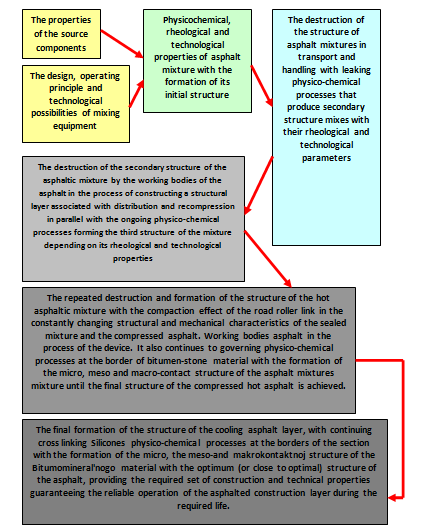 Figure 1 Formation and destruction of structure of asphalt mixtures and the blacktop to various technological stages.