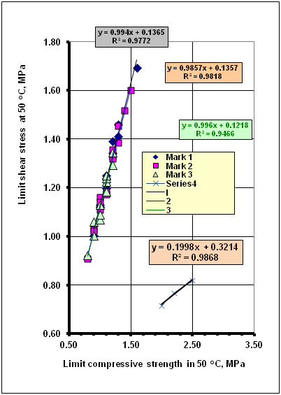 Obtained by calculations and ratios of multiple regression coefficients of correlation for asphalt I, II and III of the stamps are shown in the Table 1. Analytical expressions derived dependencies for different brands in different road-climatic zones have equal regression coefficients and high rates of multiple correlations. In Figure 1 shows a generalized correlation changes limiting shear stress by compressive strength at temperature 50˚С. Realization of the obtained relationships has made it possible to define requirements to limit the voltage shift of standard GOST 9128 temperature tests, which are shown in the Table 2. Figure 2 shows a prediction of the change in the tensile strength of the compression and shear stress in the wide range of operating and technological temperatures.