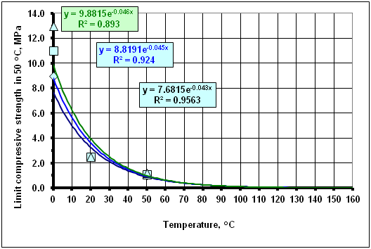 The operating temperature can be assigned within the interval from-20 to 50˚С. To technology from +80 to + 160˚С. In Figure 3 presents the exponential regression model compressive strength changes depending on the temperature of the test. Dependency analysis enables you to draw conclusions that the regression coefficients with increasing brand asphalt concrete (from III to I) decreasing, indicating a lower temperature sensitivity of asphalt concrete of Mark I. Figure 3 shows a prediction of the change in the tensile strength of the compression and shear stress in the wide range of operating and technological temperatures.