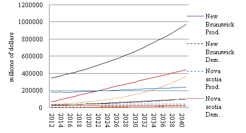Figure 1 reveals that the predicted production and demand of goods and services in New Brunswick is the same during the period of 2012-2041. In Nova Scotia, the total demand is decreasing while total production is increasing (increasing at an increasing rate until 2030 and then increasing at a decreasing rate) and demand is far lower than production during the same period. In Newfoundland and Labrador, the total demand exceeds total production during the estimation period. Production in Newfoundland and Labrador is exponentially increasing, while demand is linearly increasing. In Quebec, the total production is far higher than total demand and increasing at a higher rate than that of demand during the design period. In Prince Edward Island, the total demand is increasing at a higher rate than that of production.
