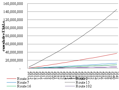 Accumulated traffic loading in equivalent single axle loads (NEt) was calculated (Table 2) based on the predicted number of trucks per year (AADTT) (Figure 3) and locally observed truck distributions combined with truck factors of (0.45, 1.18, 3.25, 0.99, 2.33, 5.91, 4.7) for truck classes 5, 6, 7, 8, 9, 10 and 13 according to the Federal Highway administration classification (FHWA 2011). Finally, cumulative equivalent single axle loads for the predicted truck traffic during the period of 2012-2041 was calculated and plotted in Figure 4.