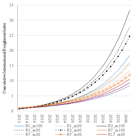 The Thornthwaite moisture index is identified as 0.07, 0.074 and 0.08 for the three environmental zones with a moisture index of 60, 80 and 100 within APC, respectively.23 The IRI0 is set between 0.7 and 1 m/km depending on the highway and coefficient a is set to 265.13