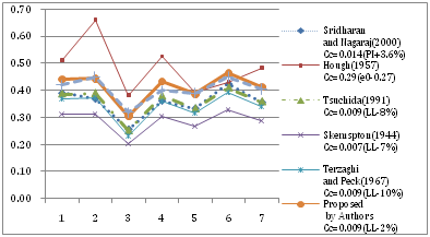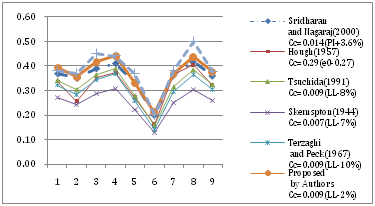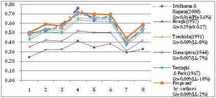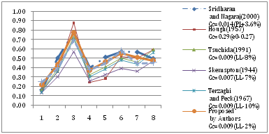 Some formulas in Table 1 and a formula proposed by authors [Cc= 0.009(LL-2.0%)] are used for analysis. The values of Cc determined by these formulas are compared with Cc received from laboratory testing results. The Cc received from laboratory testing results is considered as standard values for analysis. Analysis results are shown in tables and figures below (Figure 3-9). Correlation between Cc & other properties of soil at Sihanoukville province. The research results show that the value of Cc received from Terzaghi & Peck’s formula is close to Cc received from laboratory testing results; and Cc received from formula proposed by the authors is not deferent from Cc received from laboratory testing results.1-8