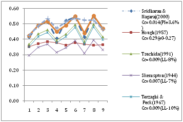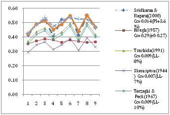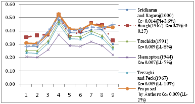 There are a lot of formulas showing the correlation between Cc and other properties of soils proposed by famous scientists in the world. Below some formulas showing correlation between Cc and other properties such as void ratio (e0), moisture content (W), liquid limit (LL), plasticity index (PI) are listed in Table 1.