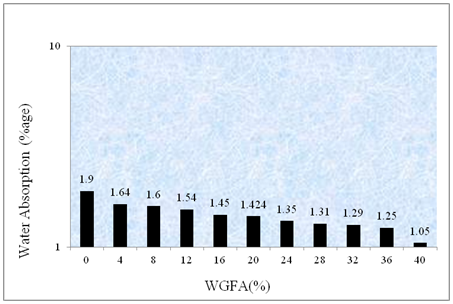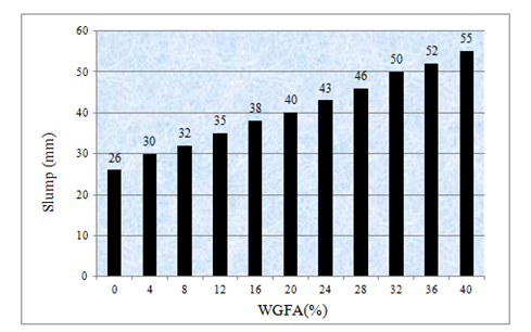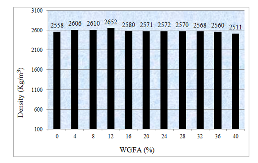 By increasing the dosage of WGFA, the density of concrete increased, maximum 3.67% and 3.32% increased as compared to ordinary concrete, at the addition of 12% of WGFA respectively, whereas on further increment of WGFA, the density of concrete decreased.