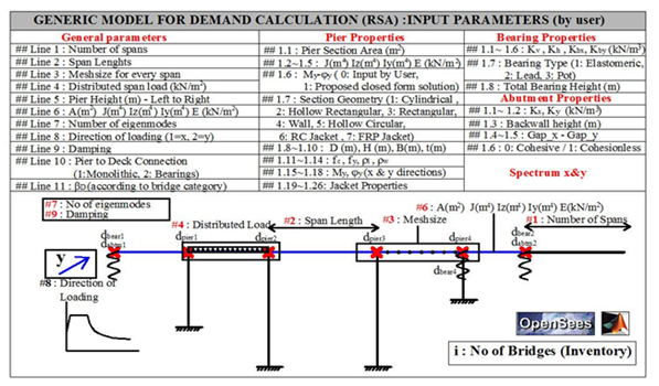 The Matlab-based software developed for the implementation of the previously described methodology and the derivation of bridge-specific fragility curves has three parts; component capacity is estimated within Part 1, component demand within Part 2, while uncertainties (in capacity and demand) and fragility curves are calculated within Part 3. In particular, component-specific limit state thresholds are calculated using the ad-hoc developed, Matlab-based software (Part 1). The user should provide geometric, material and loading information; section analysis is automatically performed in order to define threshold values in local terms and pushover analysis of bridge pier is subsequently performed in order to define threshold values in global terms. It should be underlined that both section and pushover analyses are performed using freely distributable software (AnySection,12 and OpenSees respectively), therefore they should be downloaded and installed by the user. Despite the fact that component analysis and estimation of threshold value is not time consuming, the user could alternatively use empirical equations presented above (Eq.1), which are incorporated in the software. The latter is proposed for the cases that the parameters of equation 1 are unknown and their values should be based on assumptions. The calculation of component demand, based on bridge system analysis results, is illustrated in Figure 2. The software is based on a generic simplified 3d bridge model created using the OpenSees platform.11 Input data provided by the user are depicted in Figure 2 and concern general bridge geometry and loading properties, component (pier, bearing, and abutment) properties, and the (site-specific) response spectrum. Threshold limit state values for piers are automatically calculated in displacement terms according to the geometric, material, reinforcement, loading properties and boundary conditions in each case based on empirical relationships (or calculated in Part 1 as described above). Dispersion values, calculated in line with the procedure described in,9 are also included. Seismic demand is calculated at component level based on response spectrum analysis results for various IM levels , while the evolution of damage with earthquake intensity is plotted for every component considered. Different boundary conditions at abutments are considered for the case of open and closed gap, whereas fragility curves are automatically calculated for longitudinal and transverse directions separately (Part 3), under the assumption of series connection between components (lower bound). As already mentioned, the software developed is based on a generic simplified 3d bridge model, fully parameterized, applicable to a wide range of different bridge types. The distinct steps for the development of bridge model, the calculation of component demand and the estimation of fragility curves, are summarized in Figures 3-5.