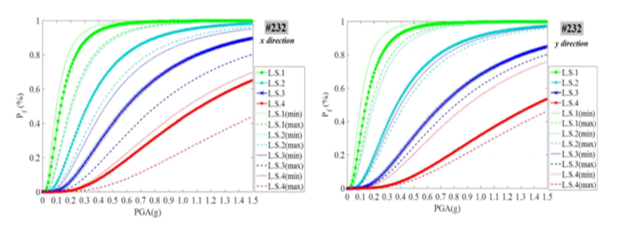 All different bridge classes of the studied section of Egnatia Motorway are presented in Figure 6. Prestressed concrete box-girder bridges with hollow rectangular piers monolithically connected to the deck, constructed using the cantilever method, is the most frequent typology (25%) due to the site topography (mountainous area). Simply supported bridges where the prestressed concrete beam deck is supported on hollow rectangular piers through elastomeric bearings are the second most frequent class in the inventory, while single span and box-girder bridges with cylindrical single-column or multi-column piers monolithically connected to the deck are also frequently encountered in this inventory (Figure 6). Fragility curves of the generic (representative) bridge of #232 and #221 classes (namely bridges with hollow rectangular piers connected through bearings to prestressed beam deck and monolithically connected to box-girder bridge deck, respectively) are depicted in Figures 7 & 8, along with upper and lower values (dashed lines -range of thresholds) for each limit state. As far as the #232 bridge class is concerned, the variation of upper and lower level fragilities from the fragility curve of the generic bri for LS1. In general, the use of the fragility curves of the generic bridge for all those in the same category may underestimate or overestimate fragility by up to 35%, however in some cases (i.e. LS1 for bridge class #221 and LS4 for #221) the underestimation may reach 50%.