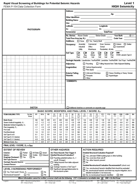 The approach for rapid vulnerability assessment is based on visual inspection.1–4 In this approach, which has been extensively used in large scale, by visual inspection of the buildings a set of parameters would be investigated, from which the buildings vulnerability level could be evaluated. Figure 1 indicates the collected data for any typical building according to FEMA P-154 (FEMA, 2015). The collected information would be enriched by supplemental data which helps to have an accurate estimation of building vulnerability level. Next, based on the statistical analysis, the sources of the residential buildings vulnerability are determined. As it is represented in Figure 1, the assigned “Basic Score” based on the type of the lateral seismic system is in-between 1 and 3.6. According to the characteristics of each building, there are either positive or negative scores added to this “Basic Score”, which indicates the actual vulnerability level for any specified structure. Subsequently, the building vulnerability score is compared with the upper and lower band limits to conclude if the building is safe, or it needs any retrofit, or it is out of the normal operating conditions and should be demolished.